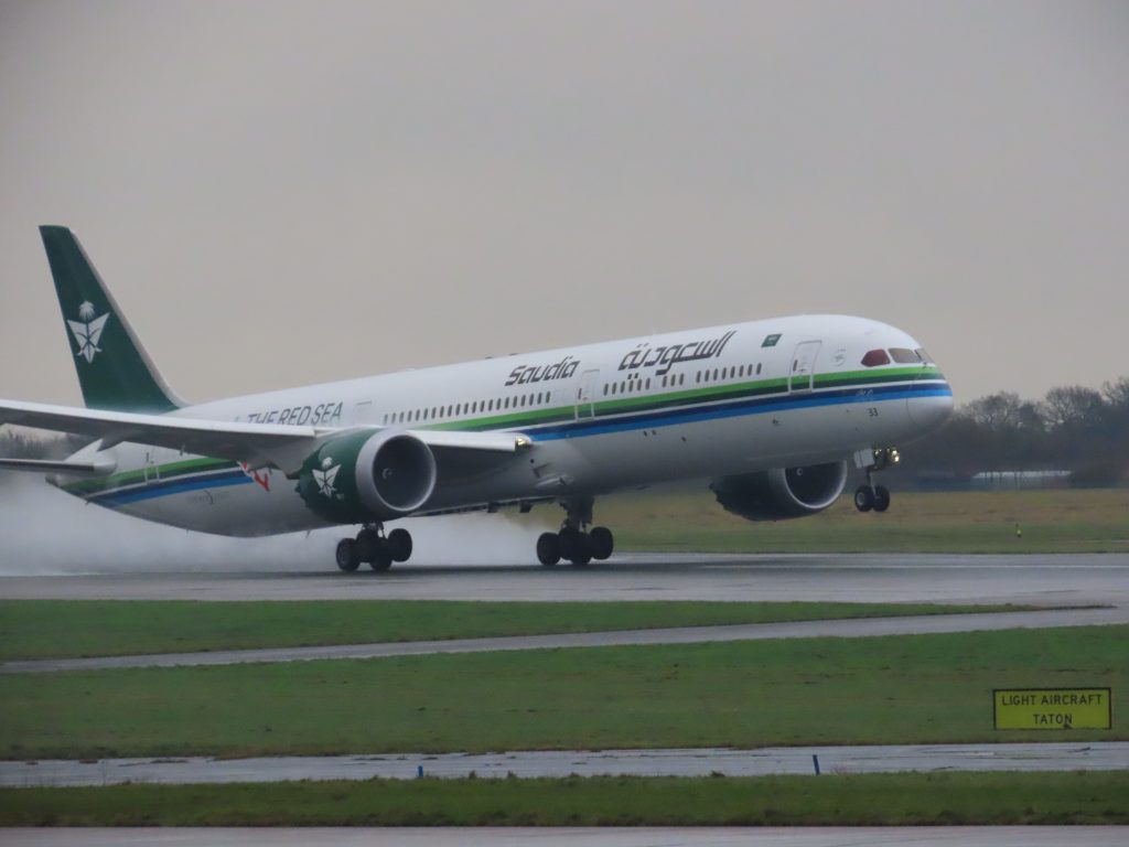 Saudi Arabia airlines (commonly known as Saudia), shown smoothly swooping into Manchester airport, after a long flight from Jeddah.